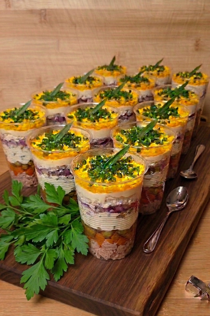MONOSAŁATKA WARSTWOWA – wielowarzywna z jajkiem i z tuńczykiem